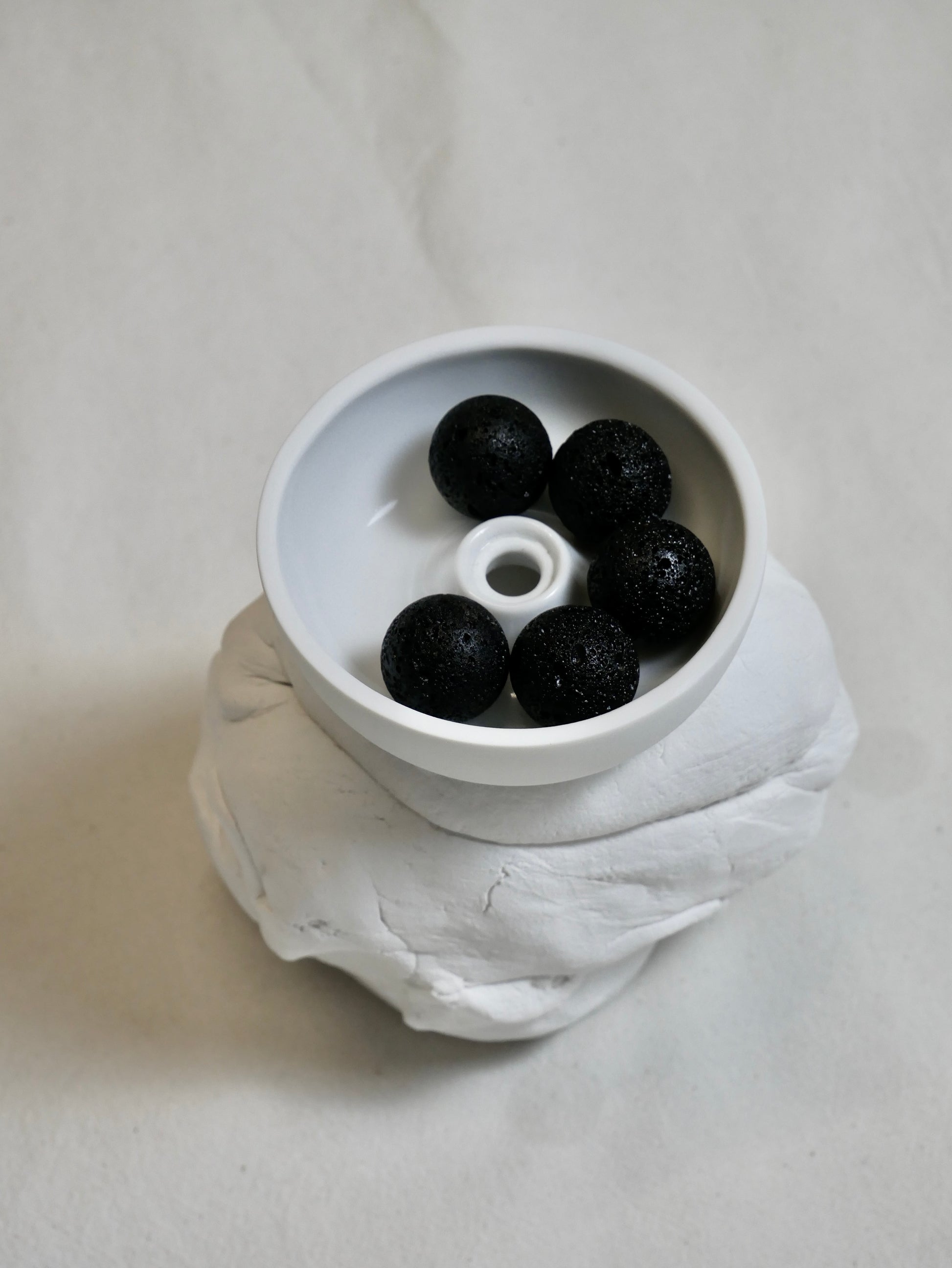 Das Objekt kommt mit fünf Lavakugeln, die die Duftöle in sich aufnehmen und über den Tag hinweg abgeben. Ganz ohne Elektronik, dafür mit viel Formschönheit und Wirkung.