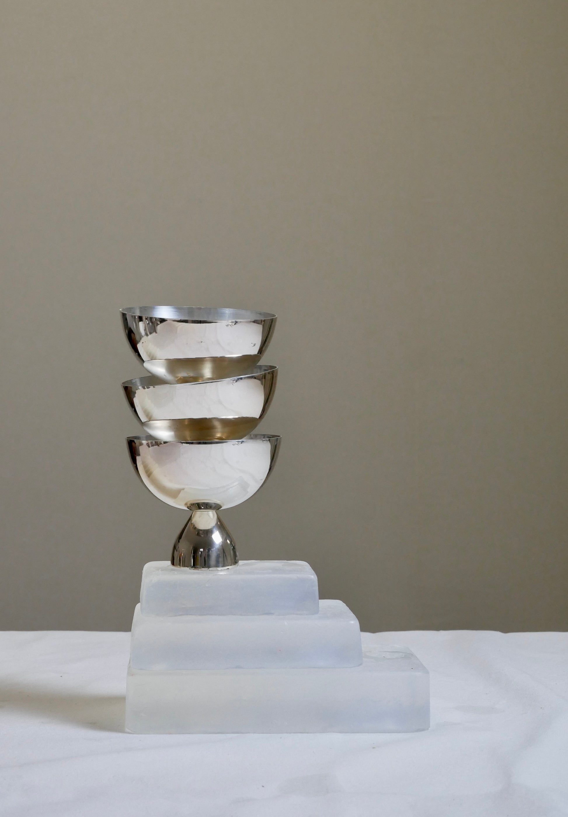 Futuristisch anmutende Eisschalen, die erst im strahlenden Silber konisch zusammenlaufen und wie eine Sanduhr im Stand sich wieder leicht wölben. Der Fuß ist ganz leicht gülden in der Farbe.
