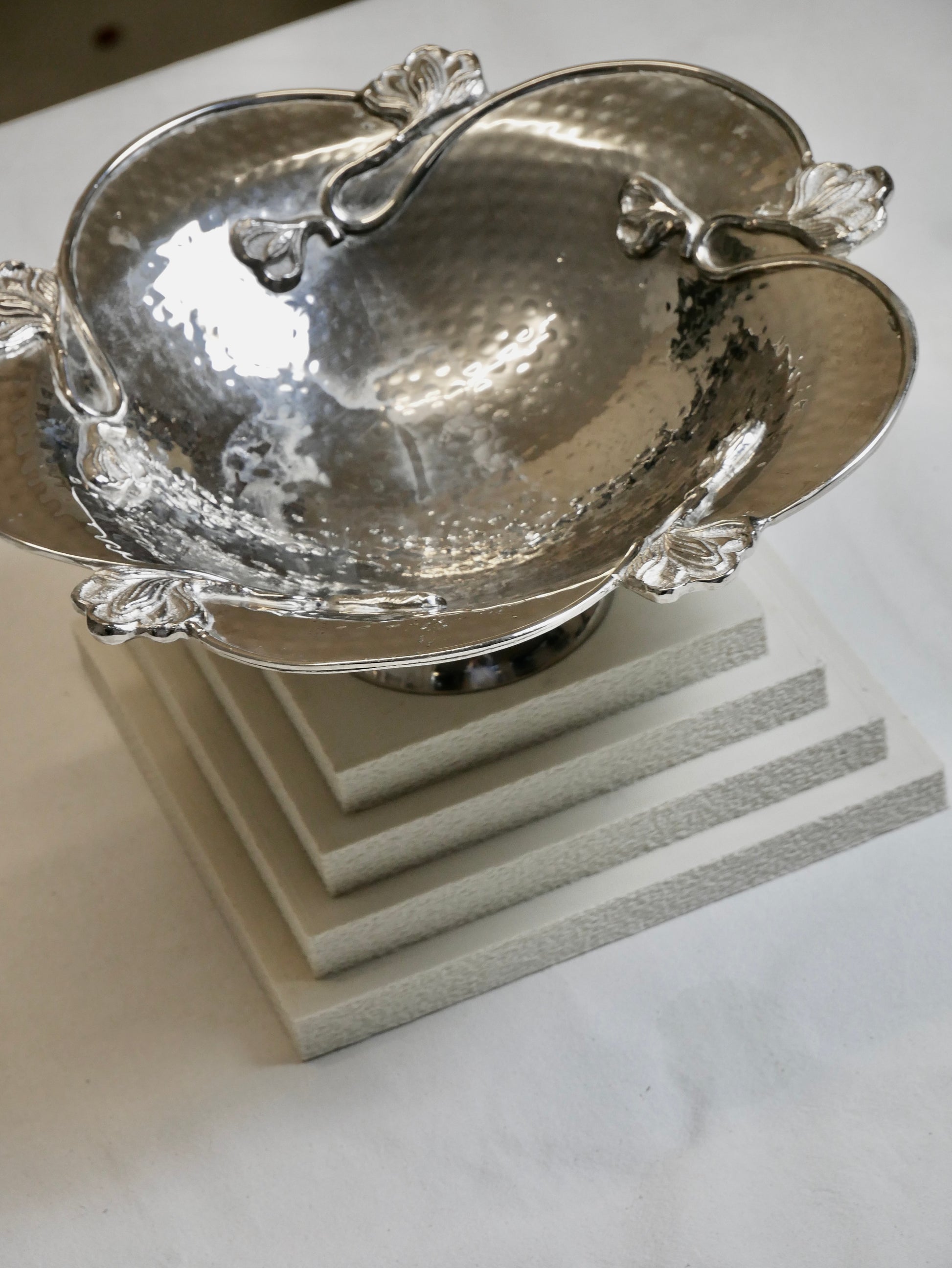 Edle Obstschale mit floralen Jugendstil Elementen, die erhaben auf der silbernen Oberfläche liegen.