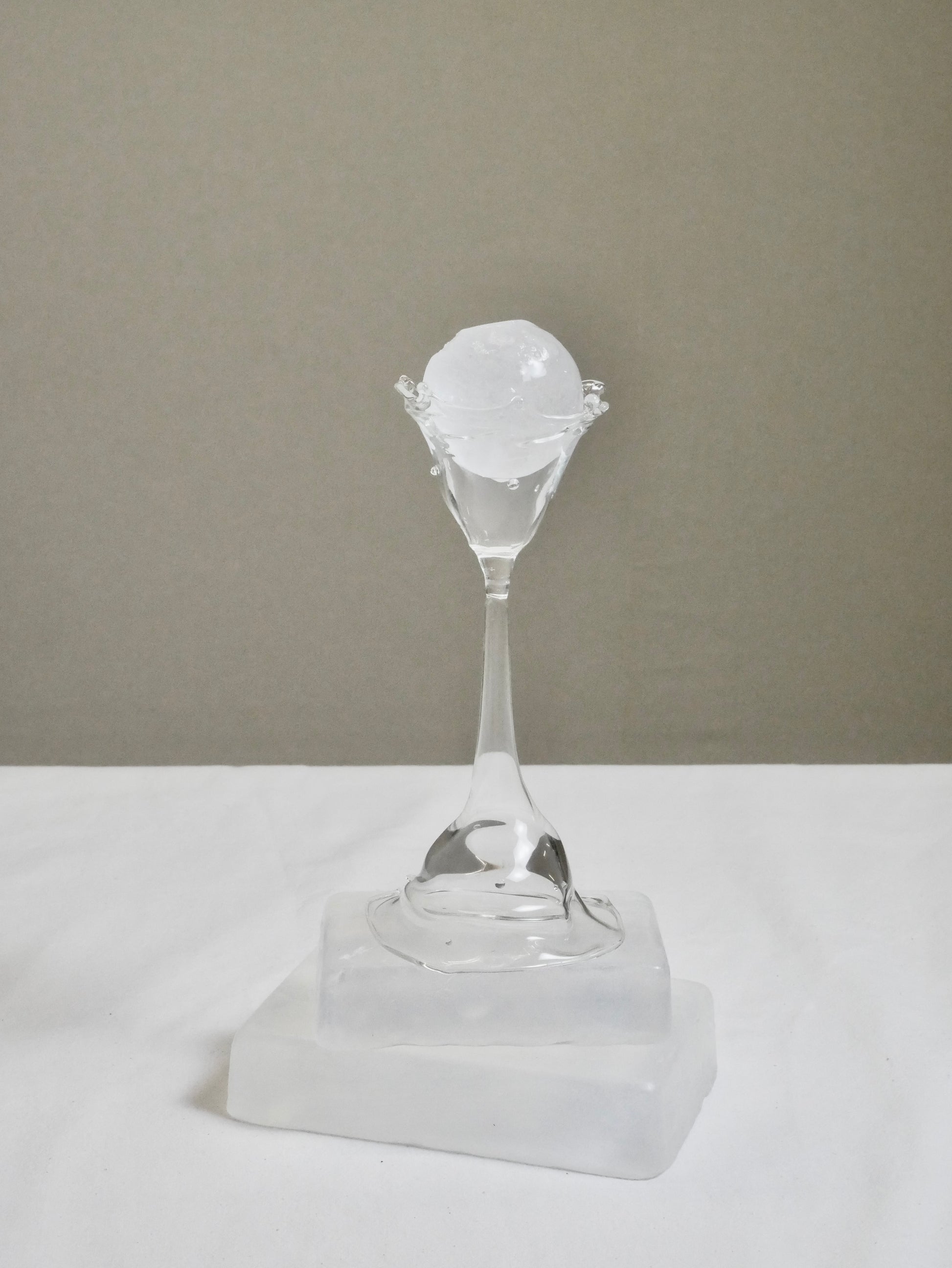 Sektglas das mundgeblasen wird und durch seine Bearbeitung die Form von fließendem Wasser annimmt.
