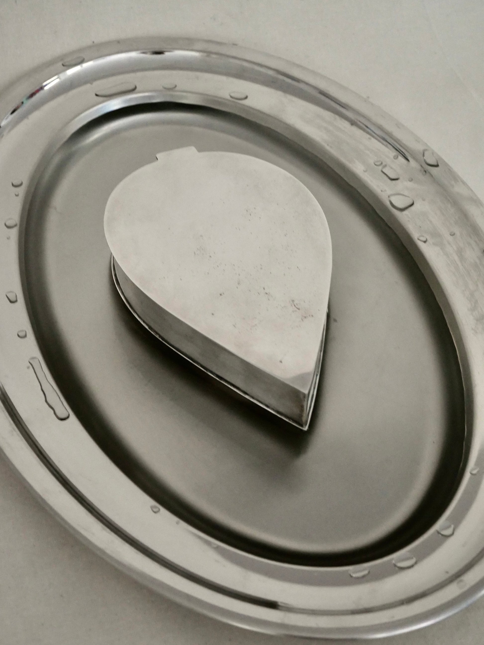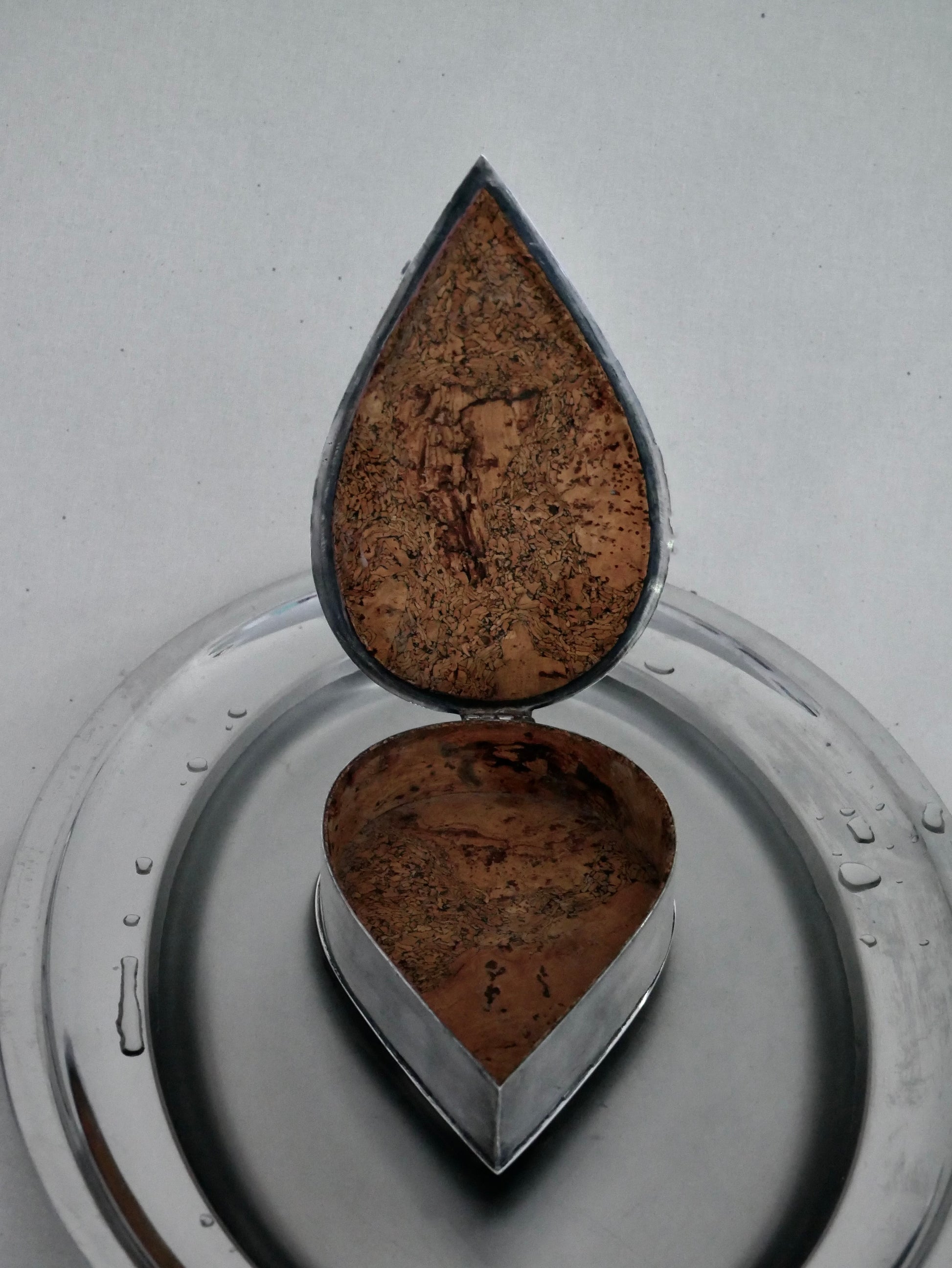 In klaren Zügen und kaltem Silber ziert sich diese formschöne Dose wie ein Tropfen aus dem kalten Wasser. Innen ausgelegt mit feinem Kork, der Schmuck oder aber auch Nüsse fein bettet.